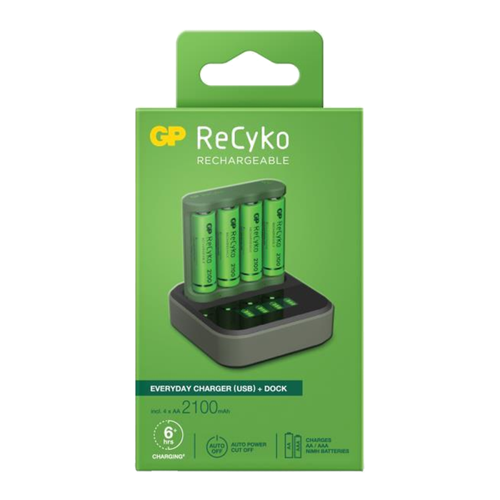 GP Recyko 4 bay USB Charger - Inc. charging dock and 4 x NiMH AA Batteries